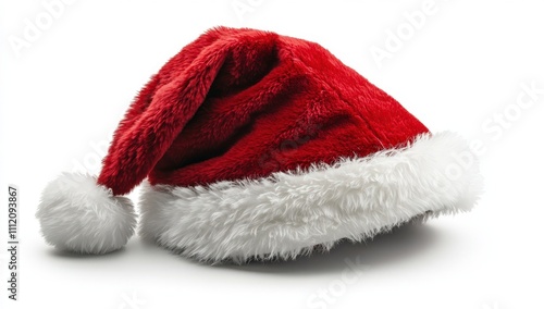 Festive red and white Santa hat, lying on its side, isolated on white background. Perfect for Christmas and winter holiday themes.