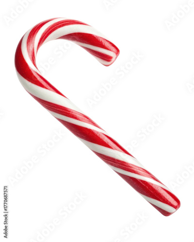 Festive red and white striped candy cane, traditional sweet christmas holiday decoration. Joyful and nostalgic symbol for season