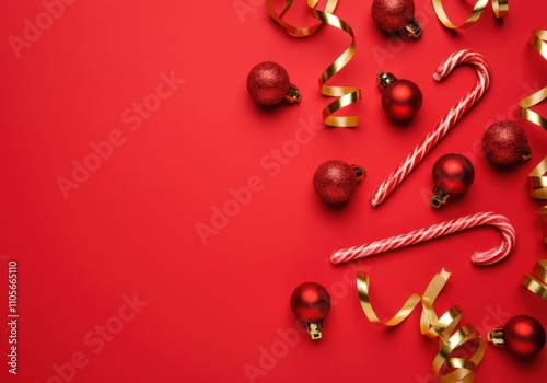 Festive red christmas background with candy canes and ornaments