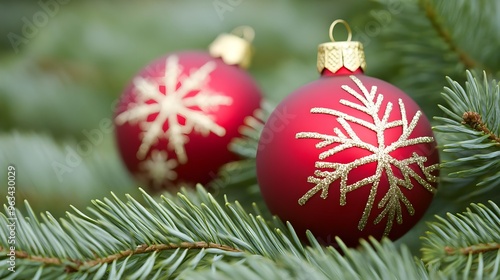 Festive red Christmas ornament hanging on a pine branch, adding a touch of holiday cheer and warmth to any season's decor.