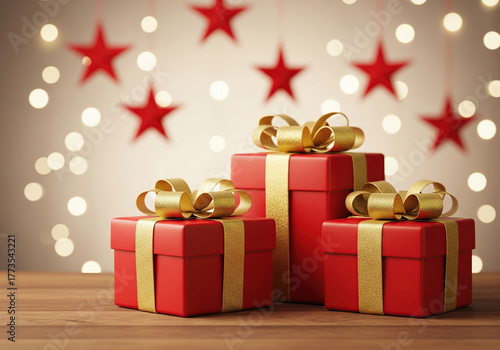 Festive red gift boxes with gold ribbons and twinkling lights background