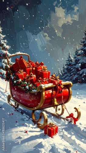 Festive Red Sleigh Overflowing with Christmas Presents in Snowy Winter Landscape.