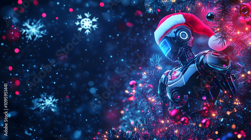 Festive Robot Surrounded by Christmas Decorations and Lights in a Winter Wonderland with Snowflakes, Christmas Tree, and Vibrant Colors