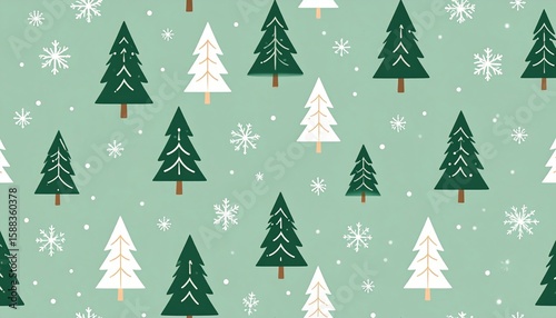 Festive seamless pattern featuring pine trees and snowflakes on a green background, perfect for winter holidays and Christmas projects