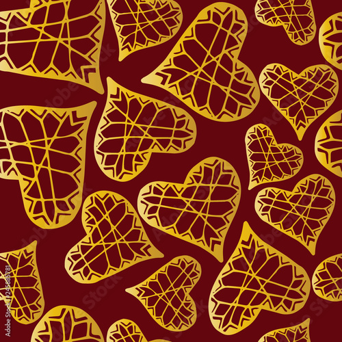 Festive seamless red pattern for St. Valentine Day with golden hearts.