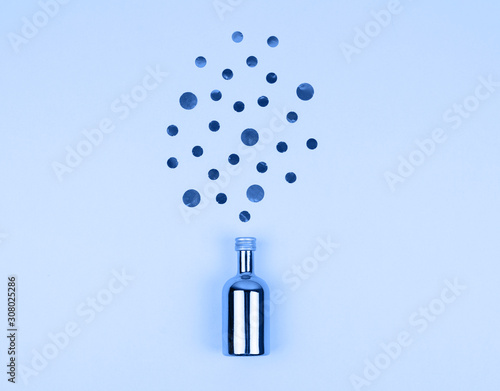 Festive shiny bottle. Abstract photo with a bottle of wine and sequins.