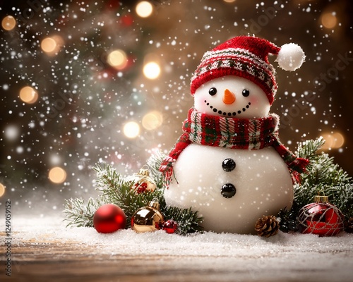 Festive snowman in snowy scene, holiday decor, perfect for greeting card or desktop background