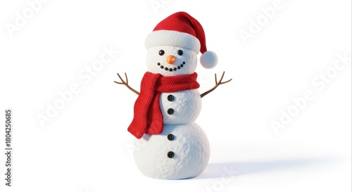 Festive Snowman with Red Scarf and Santa Hat on White Background