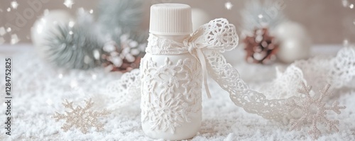 Festive snowy scene with bottle wrapped in lace and winter decorations