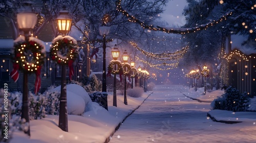 Festive Snowy Street with Glowing Christmas Lights and