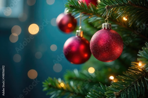 Festive sparkling Christmas ornaments hanging on a decorated tree branch , glitter, gold