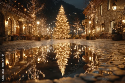 Festive street illuminated by holiday lights with reflection in a puddle at night