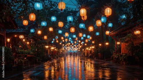 Festive Street Lights in Asian City at Night Lanterns and Reflections