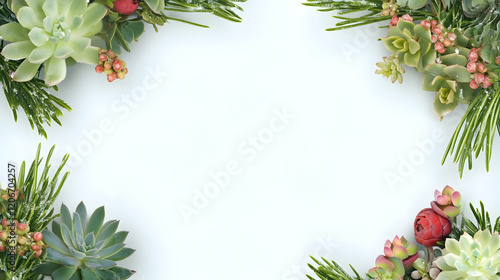 Festive succulent and pine border on white background; ideal for holiday cards or invitations