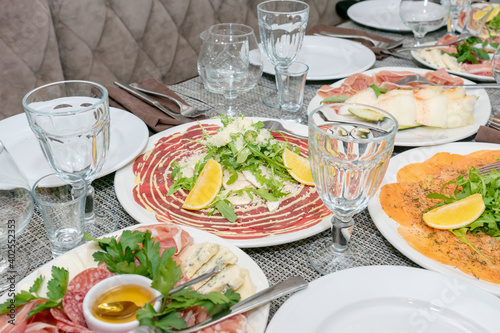Festive table setting, family dinner with served italian antipasti - marinated salmon, hamon, Carpaccio, pear, basil. Tablescape.