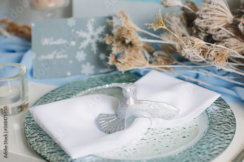 Festive table setting for Christmas and New Year in blue colors. Hummingbird figurine decorates plate.