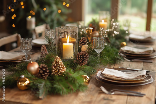 Festive table setting with candles, pine cones and decorations, Christmas, Thanksgiving, warm lighting, bokeh concept