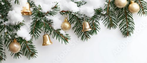 Festive tree branches covered in soft, realistic snow, with shining Christmas bells hanging gracefully, set against a flawless white background with a sharp, detailed aesthetic.
