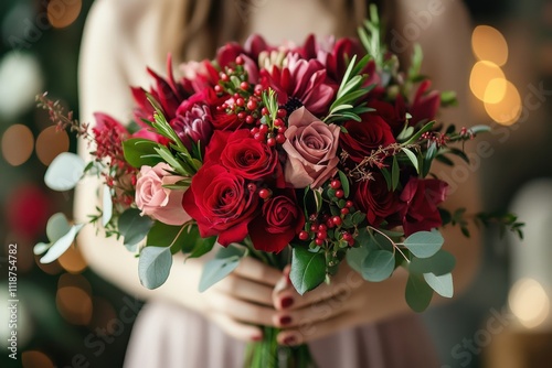 Festive Valentine bouquet filled with red roses, pink flowers, and greenery for a romantic celebration