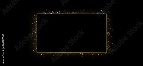 Festive vector frame with gold glitter and confetti for Christmas celebration. Black background with glowing golden particles.