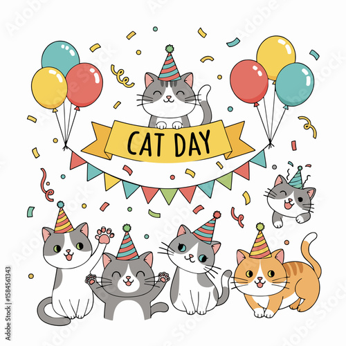 Festive Vector Illustration of Cute Cats Celebrating International Cat Day with Party Hats, Balloons, and Banner