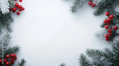 Festive Winter Background with Snow-Covered Pine Branches and Red Berries for Holiday or Seasonal Celebrations