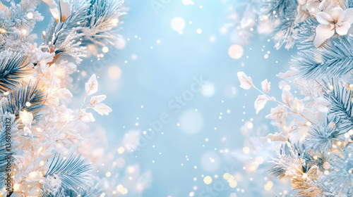 Festive Winter Holiday Season Card: Snowy Floral Frame Adorned with Glowing Bokeh Lights on a Light Blue Backdrop