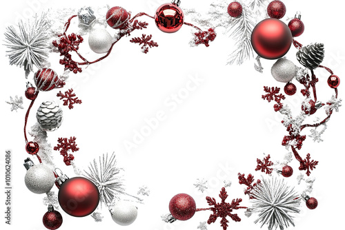 Festive wreath with red and silver ornaments on a white isolate background, perfect for holiday decorations.