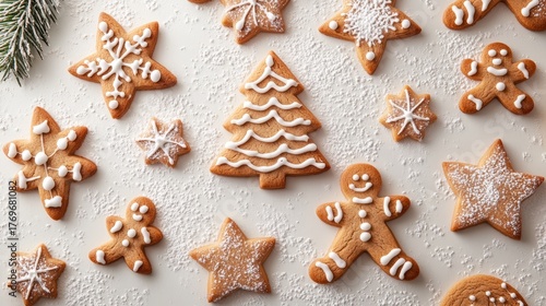 Festively decorated gingerbread cookies shaped like stars, trees, and snowflakes arranged on a light surface with powdered sugar, creating a delightful Christmas atmosphere