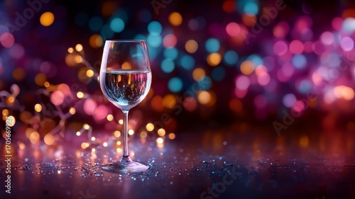 Festliche Weinglas-Dekoration mit Bokeh-Lichteffekten und warmer Atmosphäre für Weihnachten oder Neujahr