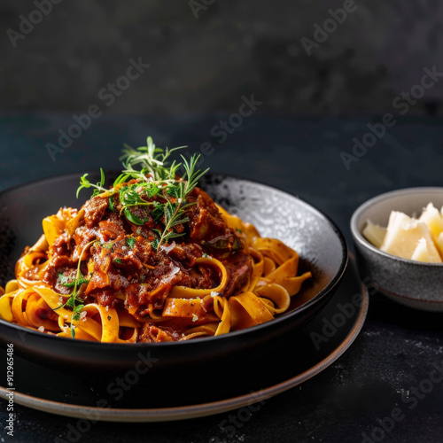 Fettuccine Pasta with Meat Sauce, Herbs, and Parmesan Cheese