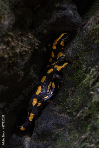 Feuersalamander im Wald, in einer Höhle bei einem Wasserfall