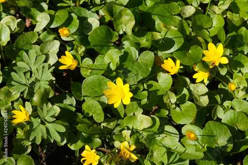 Ficaria verna or formerly ranunculus ficaria or pilewort plant green foliage with yellow flowers
