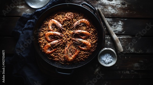Fideu Catalan Noodle Paella Grayscale paella pan only toasted golden noodles and coral pink shrimp Barcelonas noodle twist on paella