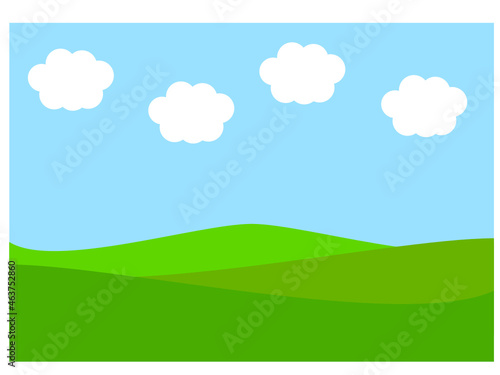 Field and sky with clouds.Green nature landscape.Hill and grass.Park or outdoor.Golf courses.Summer background.Garden or turf.Farm and countryside scenery.Cartoon vector illustration.Wallpaper meadow.