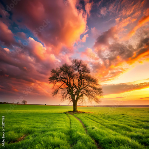 field covered in greenery with a bare tree under a shadow