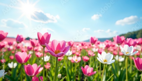 Field of blooming pink and white flowers under a sunny sky, colorful, floral, landscape