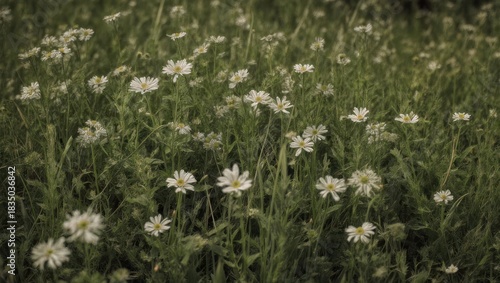 Field of delicate white flowers in lush green grass.