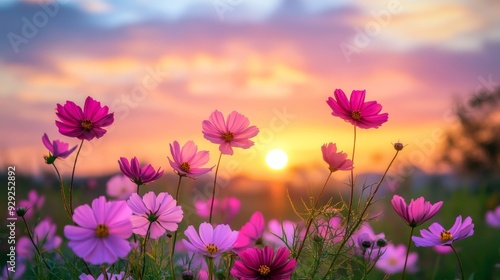 Field of flowers at sunset and dawn spring summer background with bright beautiful flowers