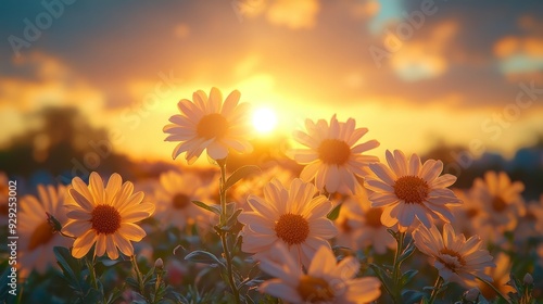 Field of flowers at sunset and dawn spring summer background with bright beautiful flowers
