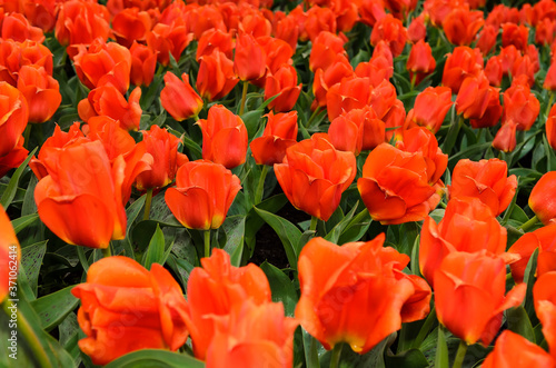Fields of very beautiful bright red tulips with buds in the form of a rose. Netherlands