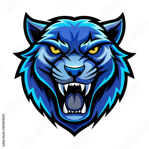 Fierce Blue Panther Head with Snarling Fangs and Glowing Accents