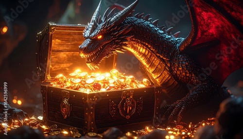 Fierce Dragon with Fiery Eyes Guards a Luminous Treasure Hoard in its Dark Lair