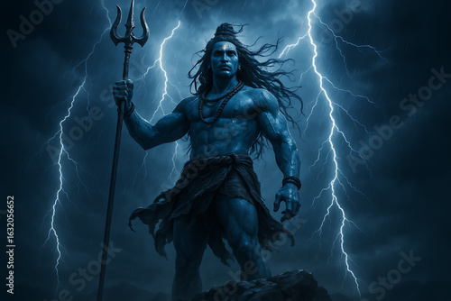 Fierce form of mahadev holding trident during lightning storm symbolizing divine power and destruction energy on sacred shib chaturthi celebrating force of mahadev