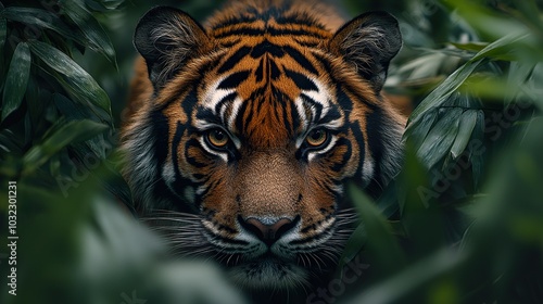 Fierce Tiger Prowling Through Dense Jungle Foliage - Stock Image for Wildlife, Nature, and Adventure Projects