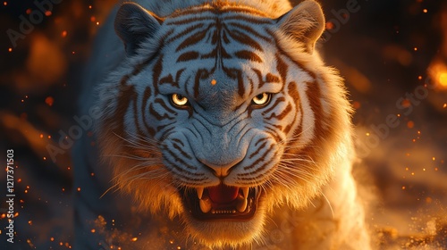 Fierce white tiger emerges from fire, jungle background, digital art, wildlife poster