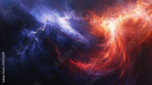 Fiery abstract art swirls dynamically contrasting cool blue and warm red hues. AI Generated