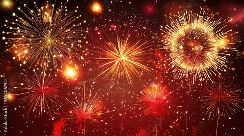 Fiery abstract fireworks with glowing golden sparks and red swirling patterns bursting from the center.