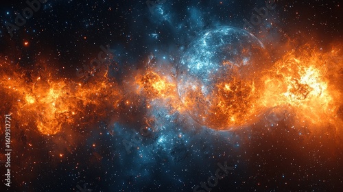 Fiery cosmic display with blue and orange hues