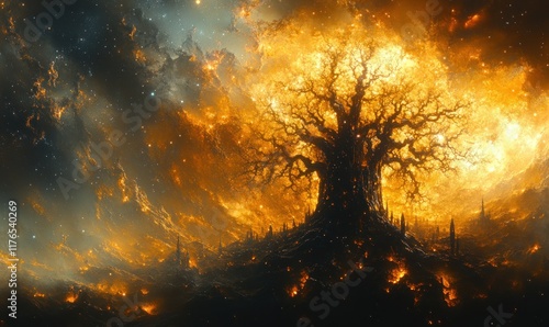 Fiery cosmic tree, burning landscape, starlit sky.